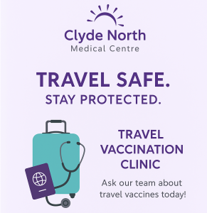 Further information can be found via the Travel Vaccination page of our website https://clydenorthmc.com.au/services/travel-advice/ or call our friendly reception team on 5991 6888.